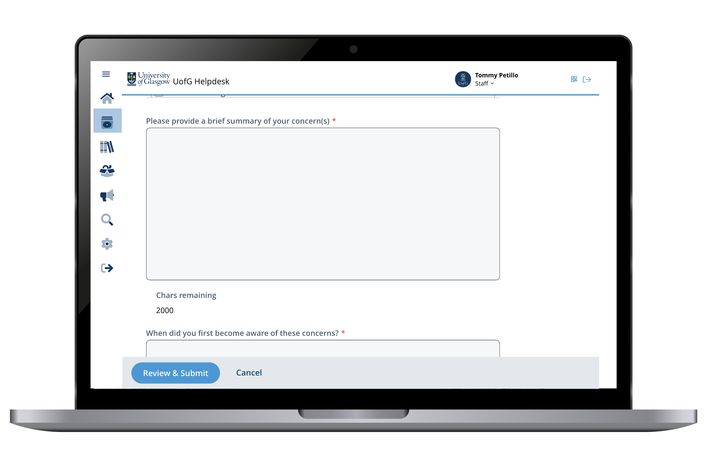 Alt Text: Screenshots of the Note of Concern form. A text field which reads: Please provide a brief summary of your concern(s), with a Review & Submit button.
