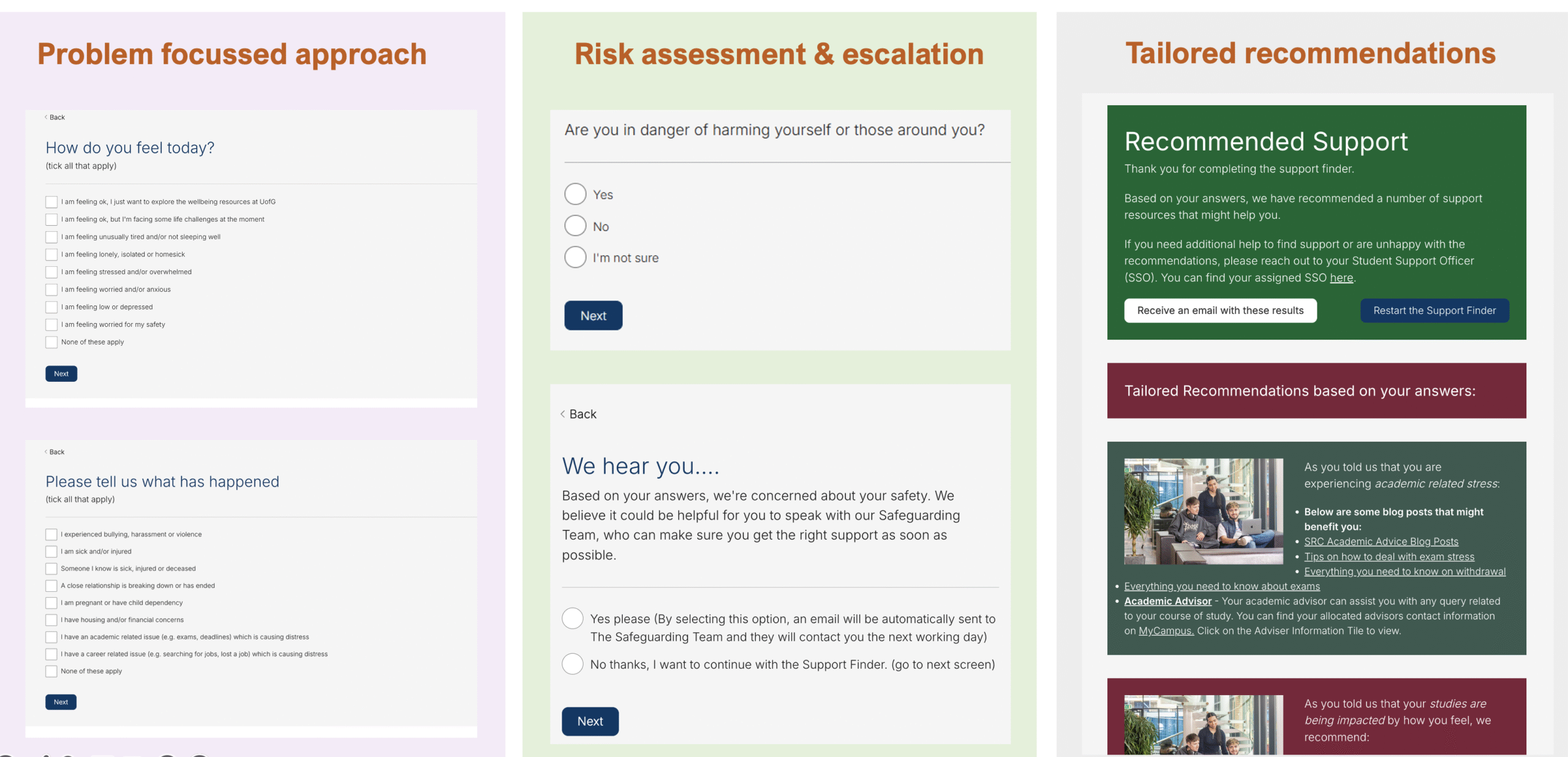 A new, personalised ‘Student Support Finder’ tool using a 5 tier triage model (Low-to-High risk) and a conditional logic questionnaire, with automated escalation process.