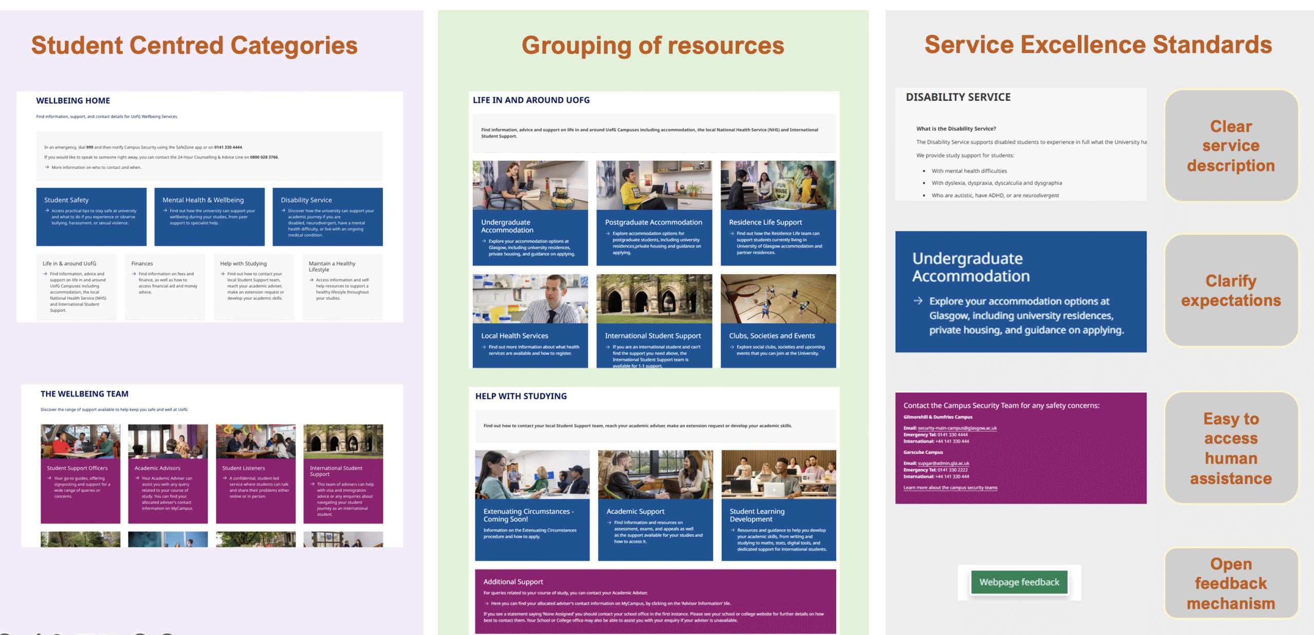 Alt Text: 3 screenshots of the new webpages, including features such as: Clear service description, Clarification of expectations, Easy to access human assistance and an open feedback mechanism.