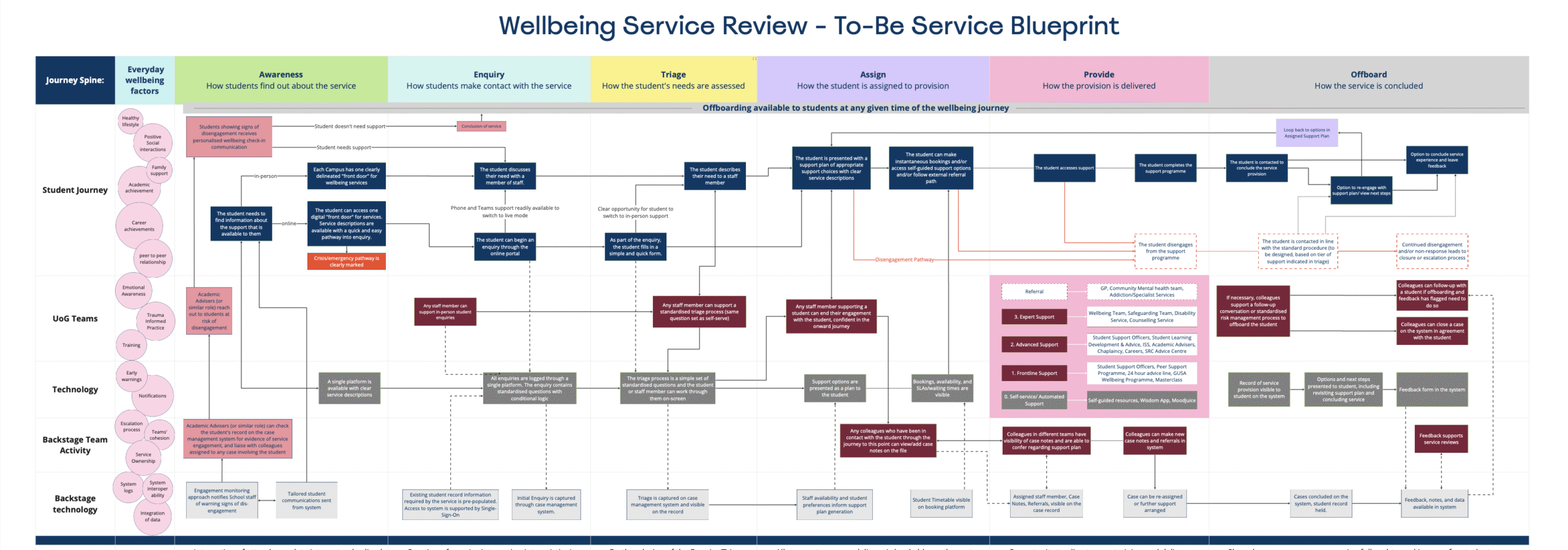 Alt Text: A Journey map visualising students and staff navigating the wellbeing services at UofG, through 6 main steps: Awareness, Enquiry, Triage, Assign, Provide and Offboard. The journey is a Service Blueprint of the proposed design, including a new triage model.